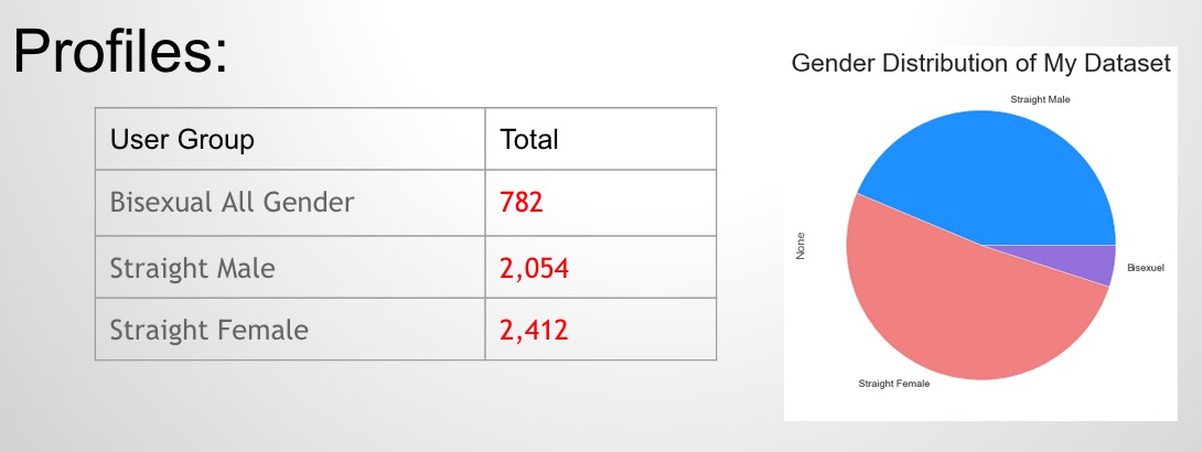 - User matching information: gender orientation, age range, location, single, purpose
