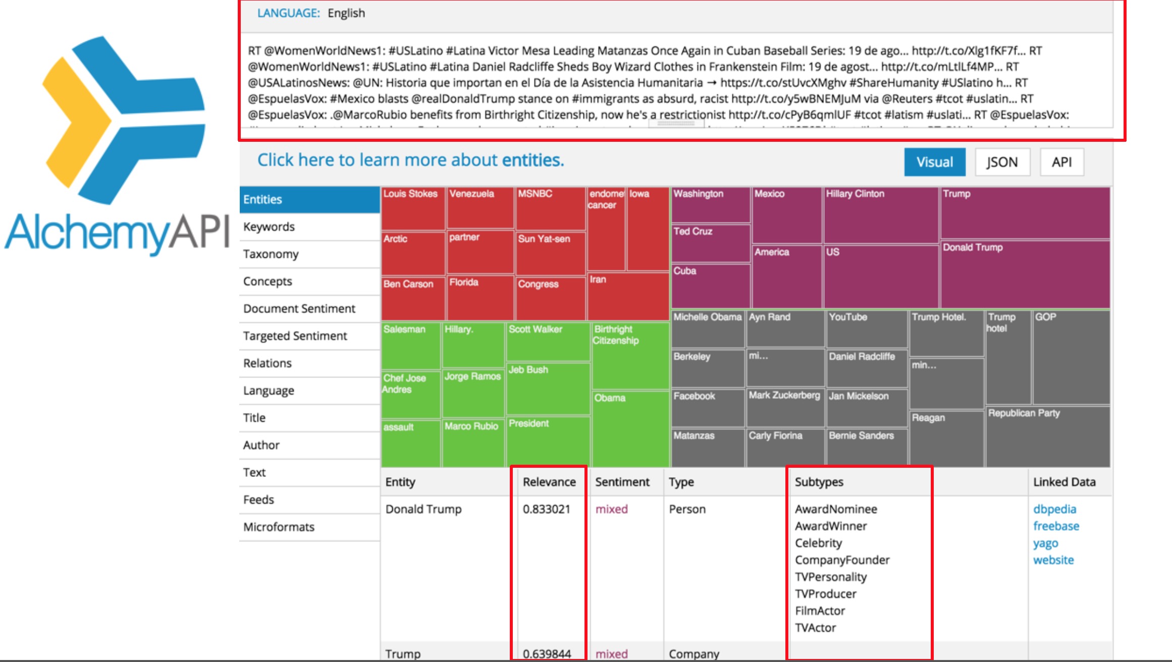 We’ve used the users’ past retweets as a basis to understand their interests. But the limited retweet records from one user may mislead the algorithm to give unbalanced weights to different topics. A better way is to analyze users’ own timeline using natural language processing tool. This way, the system can understand the user’s interest from everything he/she has participated in the past. To experiment, here we use AlchemyAPI as a NLP tool to extract entities and relevance scores from user timeline.